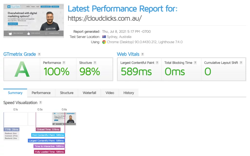 Anyways, if you’re not into websites, this is all mumbo jumbo. What you should do is this. When you get a quote for website development or web services from other sunshine coast web design agencies, ask this: What is the finished website’s gtmetrix score? And, what is the Google Page Speed Insight Score of the final website?